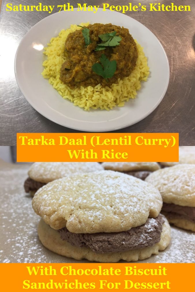 Tarka Daal (Lentil Curry) & Rice plus Chocolate Biscuit Sandwiches, by The Chef from Bulwell Academy. Suggested donation £5